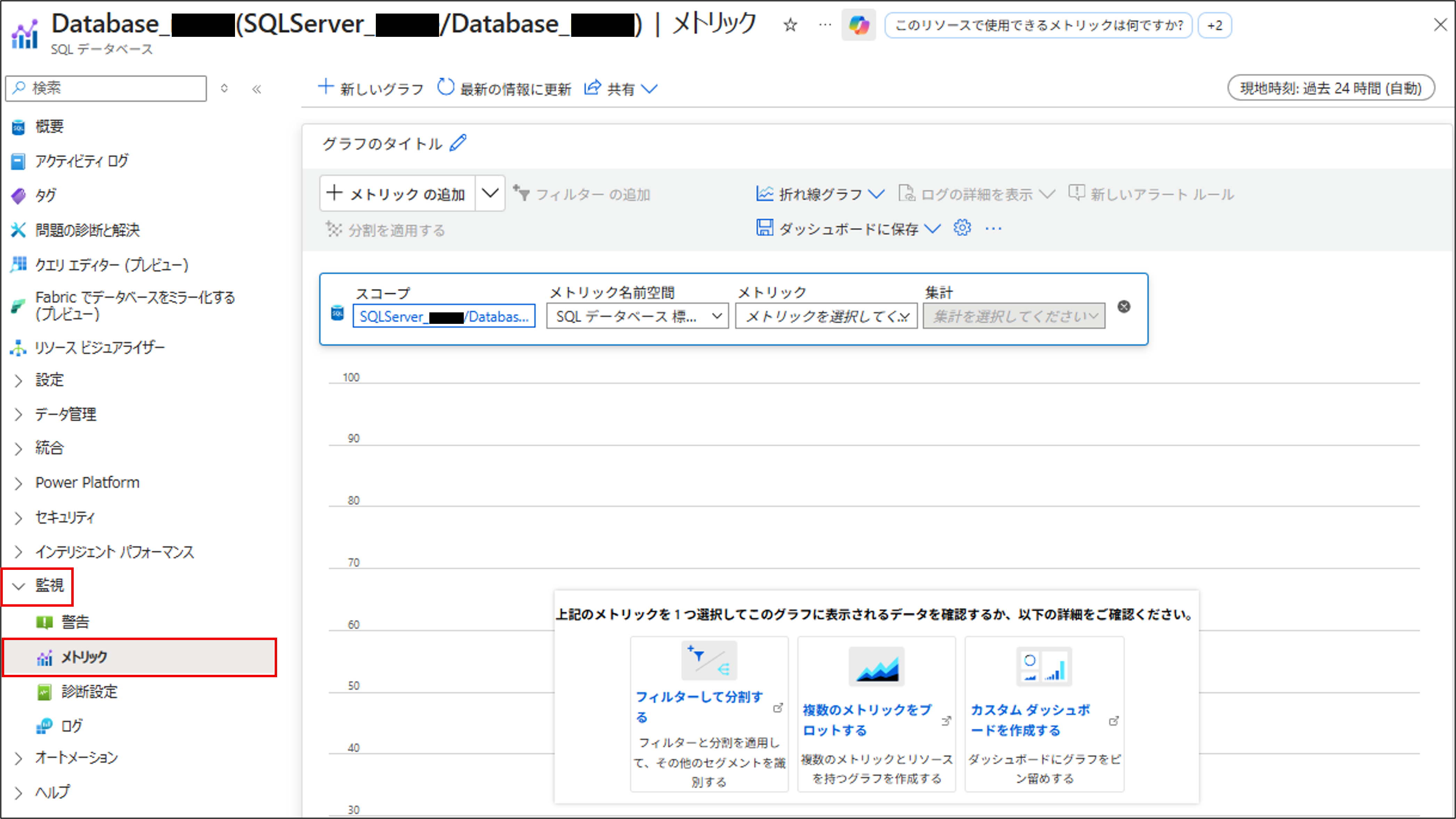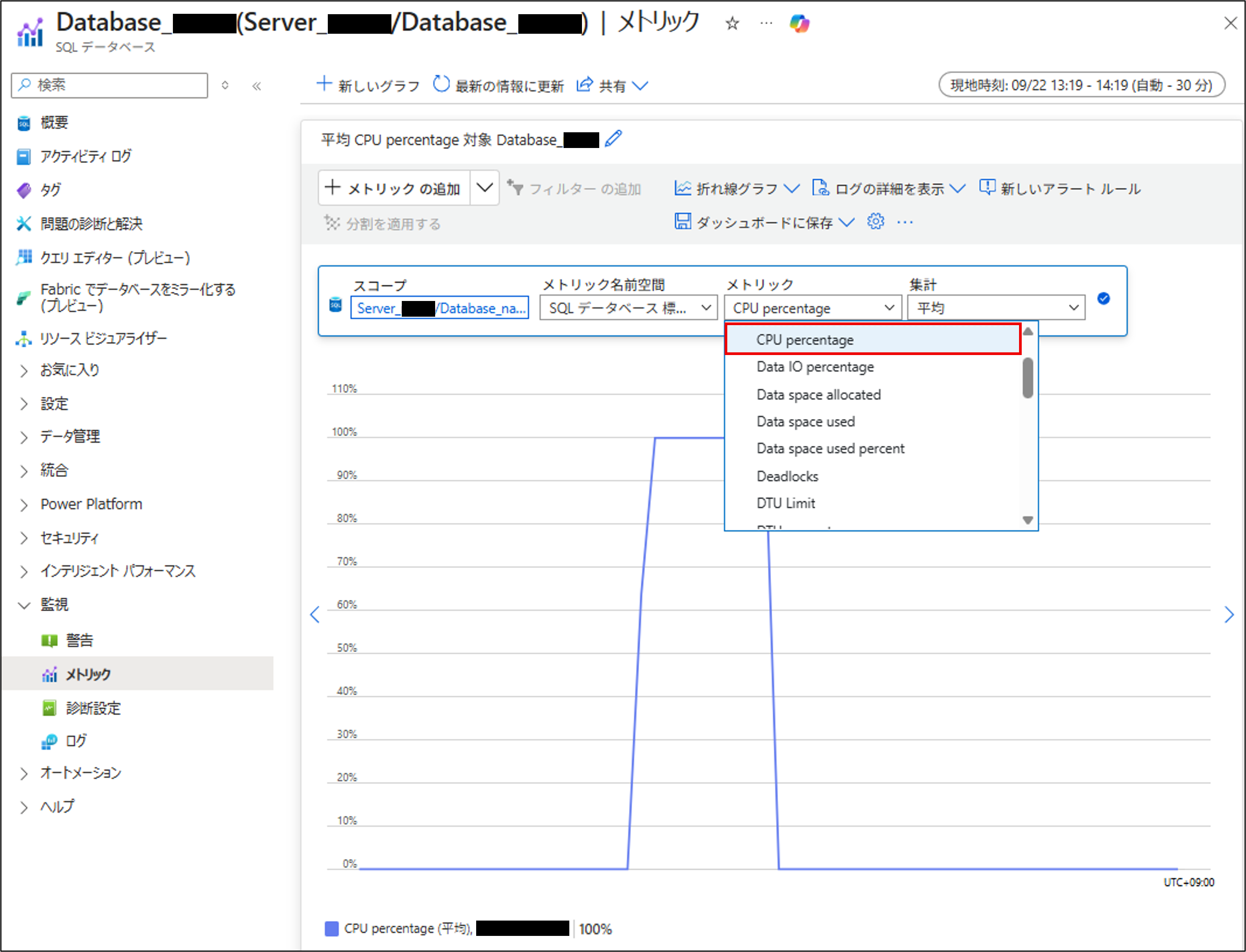 「メトリック」のプルダウンで「CPU percentage(CPU 使用率)」または「Data IO percentage(Data IO 使用率)」または「Log IO percentage(Log IO 使用率)」を選択